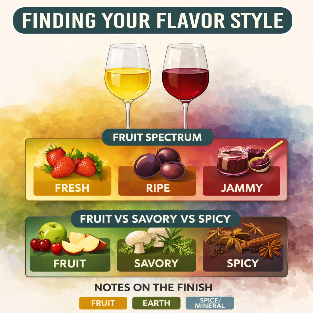A second general, but helpful, comparison is fruit vs. savory vs. spicy. As you might infer, fruit‑forward wines taste mostly like fruit, with very little earth or spice getting in the way. Savory or earthy wines offer nuances that remind people of mushrooms, forest floor, dried leaves, olives, or even a little meatiness. Spicy wines can hint at black pepper, baking spices, cocoa, coffee, or tobacco. The most important takeaway: none of these are better, just different. A pure, fruit‑forward wine might be perfect on a sunny afternoon, while an earthy or spicy one might feel just right with a cozy dinner.